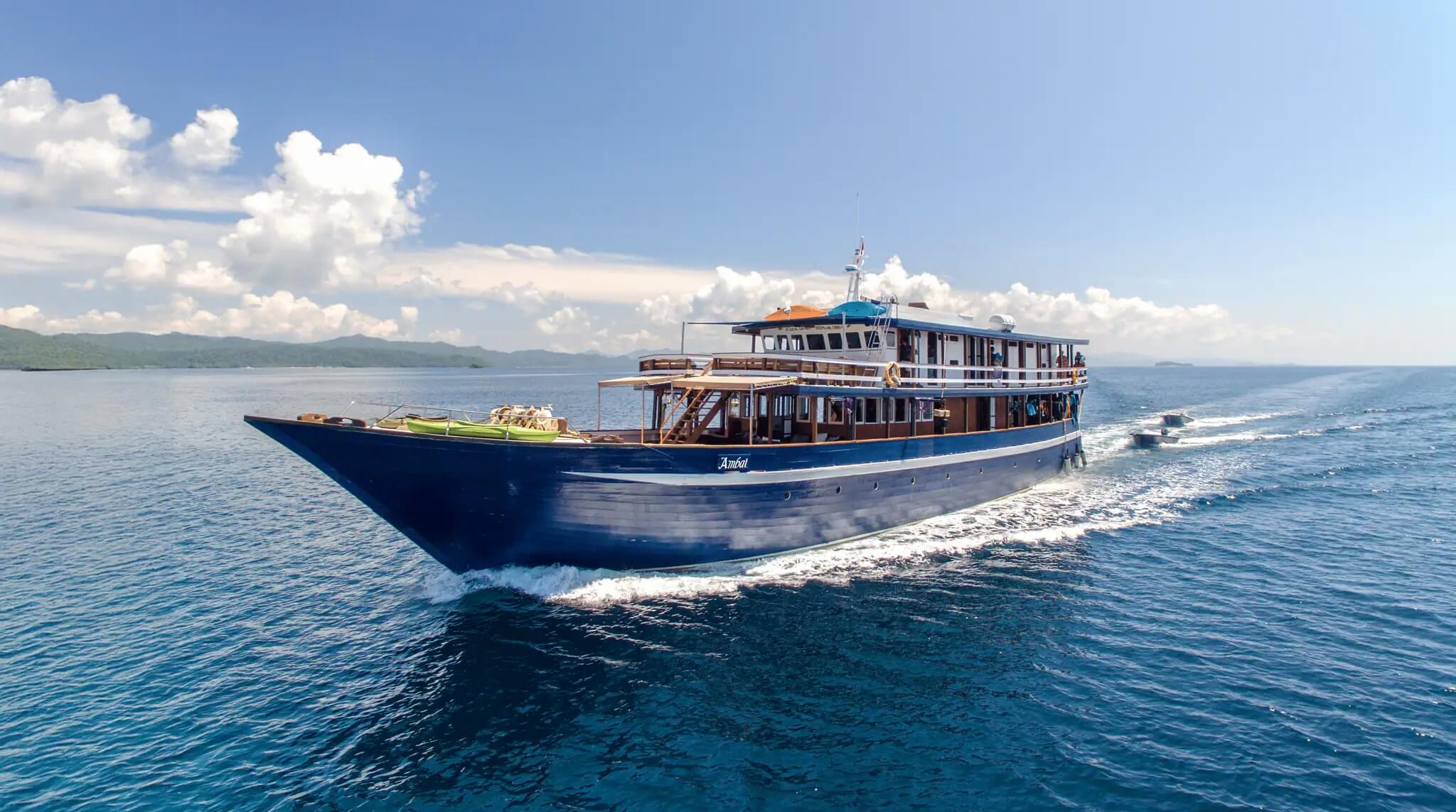 - Nous explorerons la région à bord du Ambai, un bateau de croisière de luxe pouvant accueillir 16 passagers, spécialement conçu pour l'exploration sous-marine et affrété exclusivement pour notre groupe de snorkeleurs. Le Ambai dispose de 8 cabines confortables, toutes équipées d'une climatisation à réglage individuel. Chaque cabine dispose d’une salle de bains privative avec toilettes séparées et douche avec eau chaude, ainsi que de nombreux espaces de rangement pour vos effets personnels.