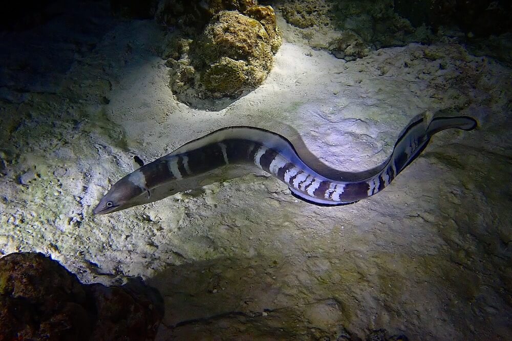 The main snorkeling area is the North Lagoon, surrounded by the restaurant, the dive and snorkel center, and overwater bungalows. This shallow, sandy area is visited by Green Turtles, Blacktip Sharks, Snake Eels, Jacks and Groupers.